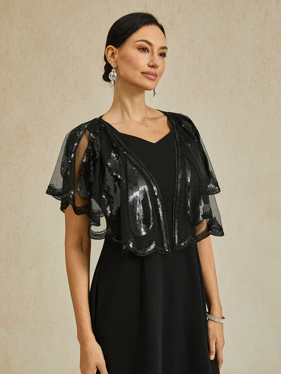 Design: Open-front wrap cape, sleeveless coverage, vintage Gatsby style, beaded and sequin embroidery, one-size fits most