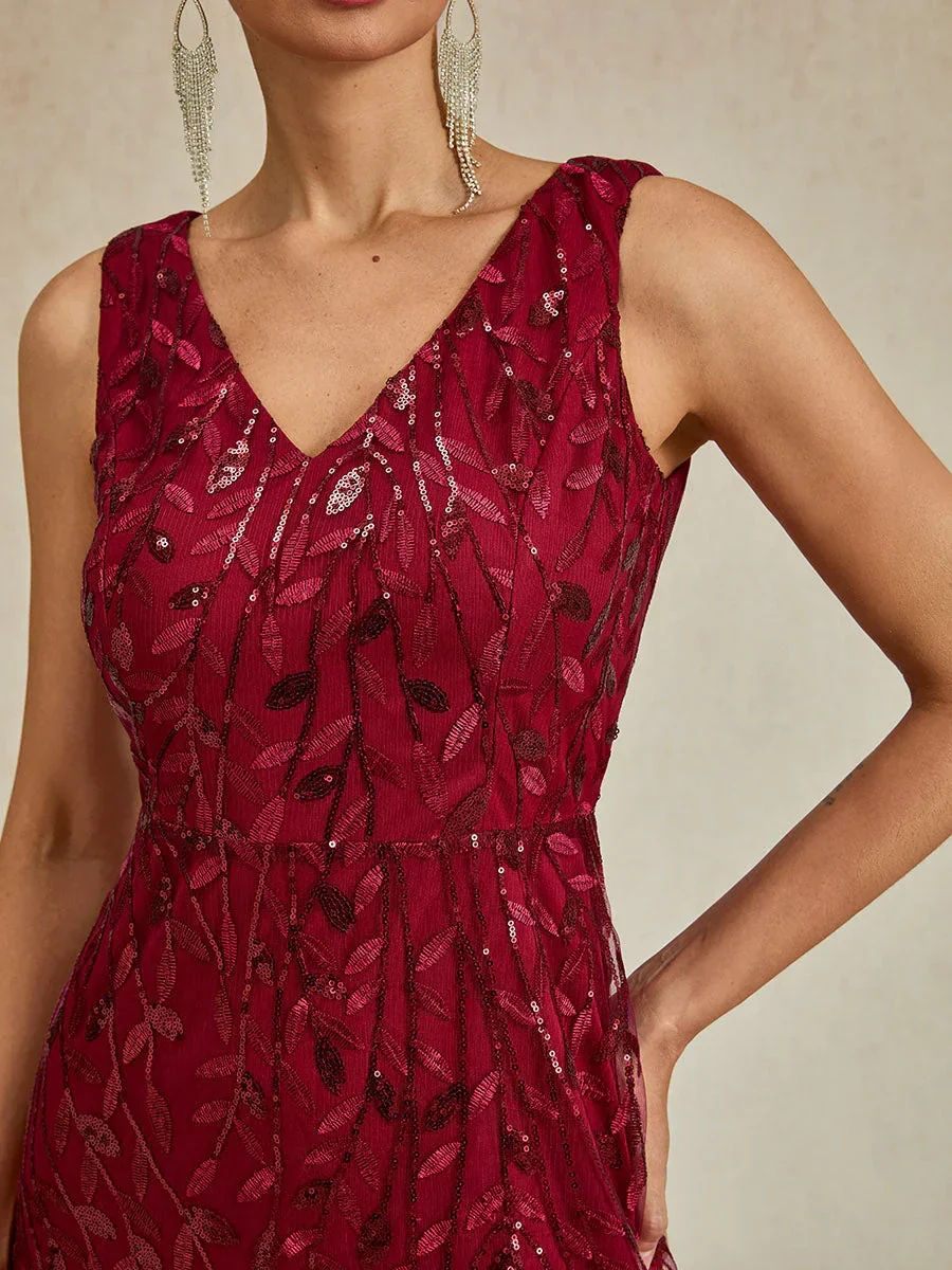 Gracefully tailored to enhance your natural curves, this sleeveless V-neck mermaid gown features intricate bead and sequin embroidery throughout in a delicate leaf motif. The figure-hugging silhouette flares into a floor-length hem detailed with a sheer mesh insert, adding dimension and movement to your walk. A perfect choice for black-tie weddings or formal galas, this gown balances dazzling sparkle with refined elegance.